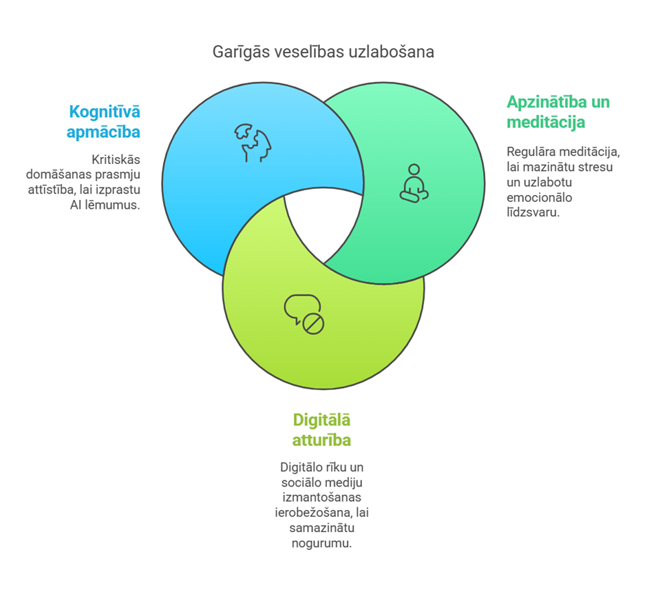 AI attīstība rada iespējas un izaicinājumus, kas ietekmē indivīdus un sabiedrību. Lai AI kļūtu par sabiedrības palīgu, nevis draudu, ir jāizstrādā efektīvi stresa pārvarēšanas mehānismi, kas ietver tehnoloģisko pratību, garīgās veselības atbalstu un ētisku AI pārvaldību. Kritiskā domāšana, datu aizsardzība un atbildīga AI lietošana ir galvenie faktori, kas palīdzēs cilvēkiem integrēt AI savā dzīvē un pielāgoties strauji mainīgajam tehnoloģiskajam laikmetam.